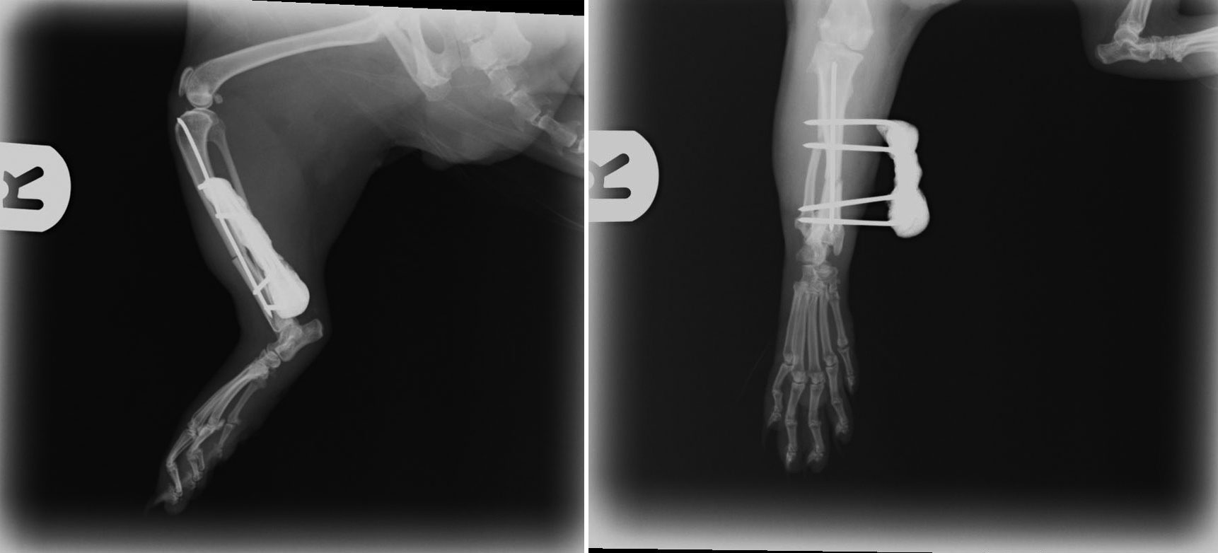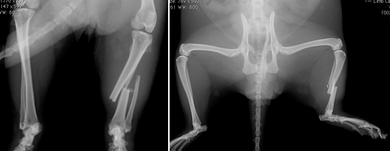 This presented us with quite the challenge because JD’s bones were so tiny. I performed an extremely fiddly operation to fix his bones back together again. Below you can see the x-rays we took after the operation - the white lines are tiny 1mm wide pins that are holding the two ends of bone together whilst the body heals them. The operation went extremely well and JD should make a full recovery.