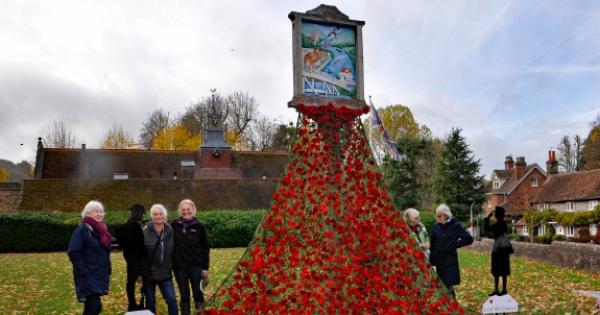Under the supervision of Goring Parish Council, these were attached to netting and are displayed at the village sign in Rectory Gardens. There were even a few left to make a matching postbox topper.