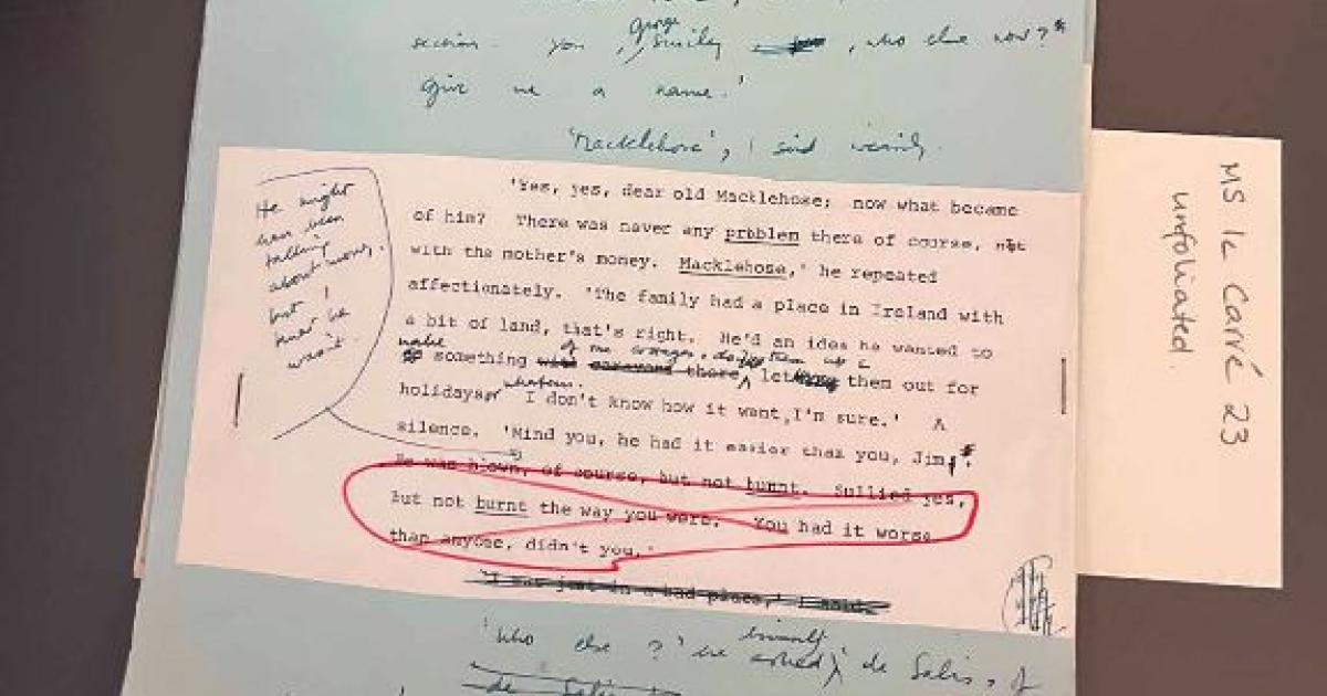John le Carré went through repeated changes as he struggled with the opening to Tinker Tailor Soldier Spy, constantly adjusting the viewpoint, the emphasis and details of the setting with various pages in the process (handwritten and typed) on display.