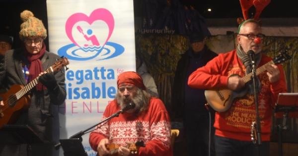 About 100 people sat on wooden benches under large blue umbrellas on the pub’s decking for the performance in aid of Regatta for the Disabled.