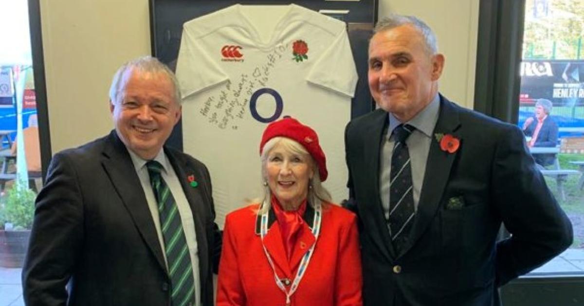 Henley Rugby Club welcomed Poppy Appeal collectors to Dry Leas on their home game days during the Remembrance period. On the day of the match with Dorking veteran collector Connie Butt offered special rugby poppy pins to club members in return for donations. She is pictured with club chairman Chris Nixon, left, and Dorking Rugby Club president Jon Watts